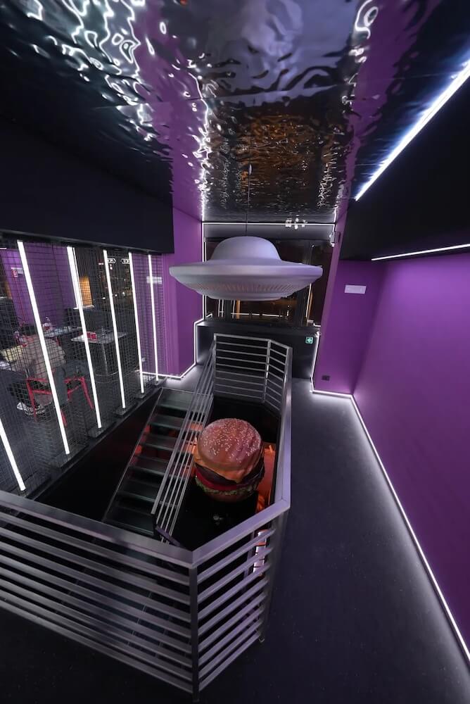 Es geht um eine riesige Investition (Gerüchten zufolge liegt die Miete bei fast 10.000 Euro pro Monat), um ein komplett violettes Lokal zu schaffen, mit einem riesigen Plastikburger, der dich in einem Raumschiff des Geschmacks willkommen zu heißen scheint.