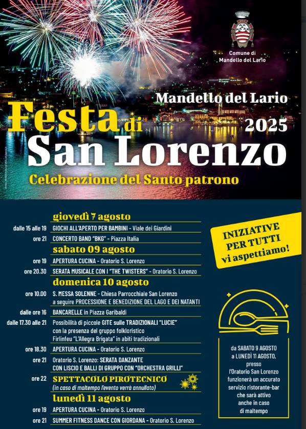 Las celebraciones de la noche de San Lorenzo comienzan mañana 7 de agosto con juegos al aire libre de 15.00 a 19.00 horas para los niños, seguidos por la noche por el concierto de pop-rock del grupo BKG en Piazza Italia hacia las 21.00 horas. Más información aquí.